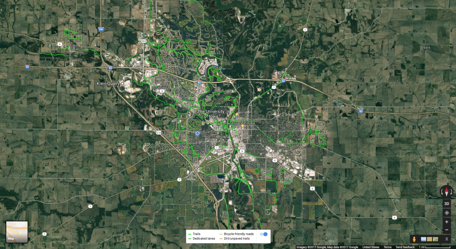 The Interactive Bike Trails Video Tour involves the following: (1) Upload videos of local bike trails and suggested routes, (2) Create YouTube playlists of these ride segments to form complete ride videos, (3) Provide links from each video to choices of where to go next for an interactive experience, (4) Include a narrated Google Maps guide showing a bird’s eye view of each ride by enabling satellite view and bike trails view. — Any municipality or community can replicate this project to create their own local guided video bike tours (or even walking tours). To request your own personalized bike trail in the Iowa City area, visit IowaCityBikeTrails.com/guide.